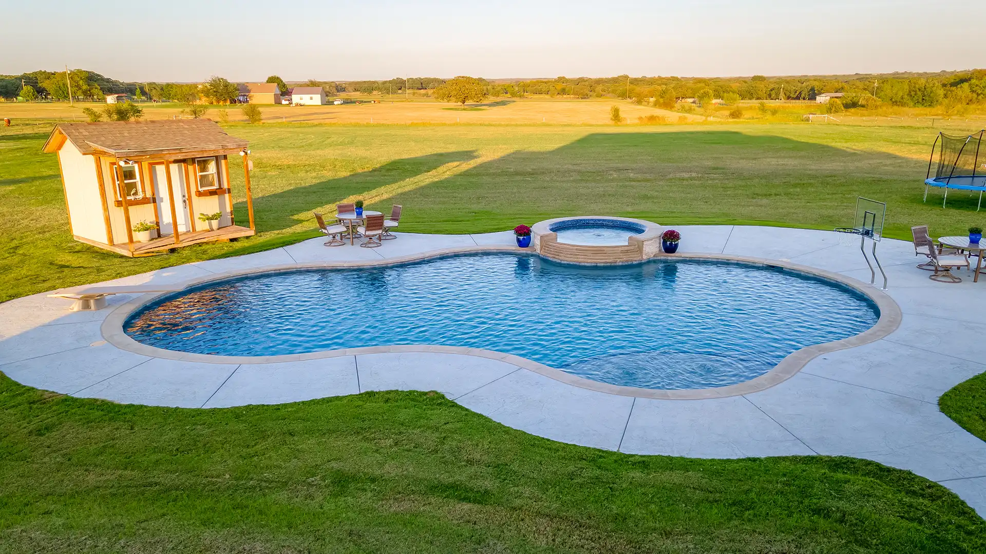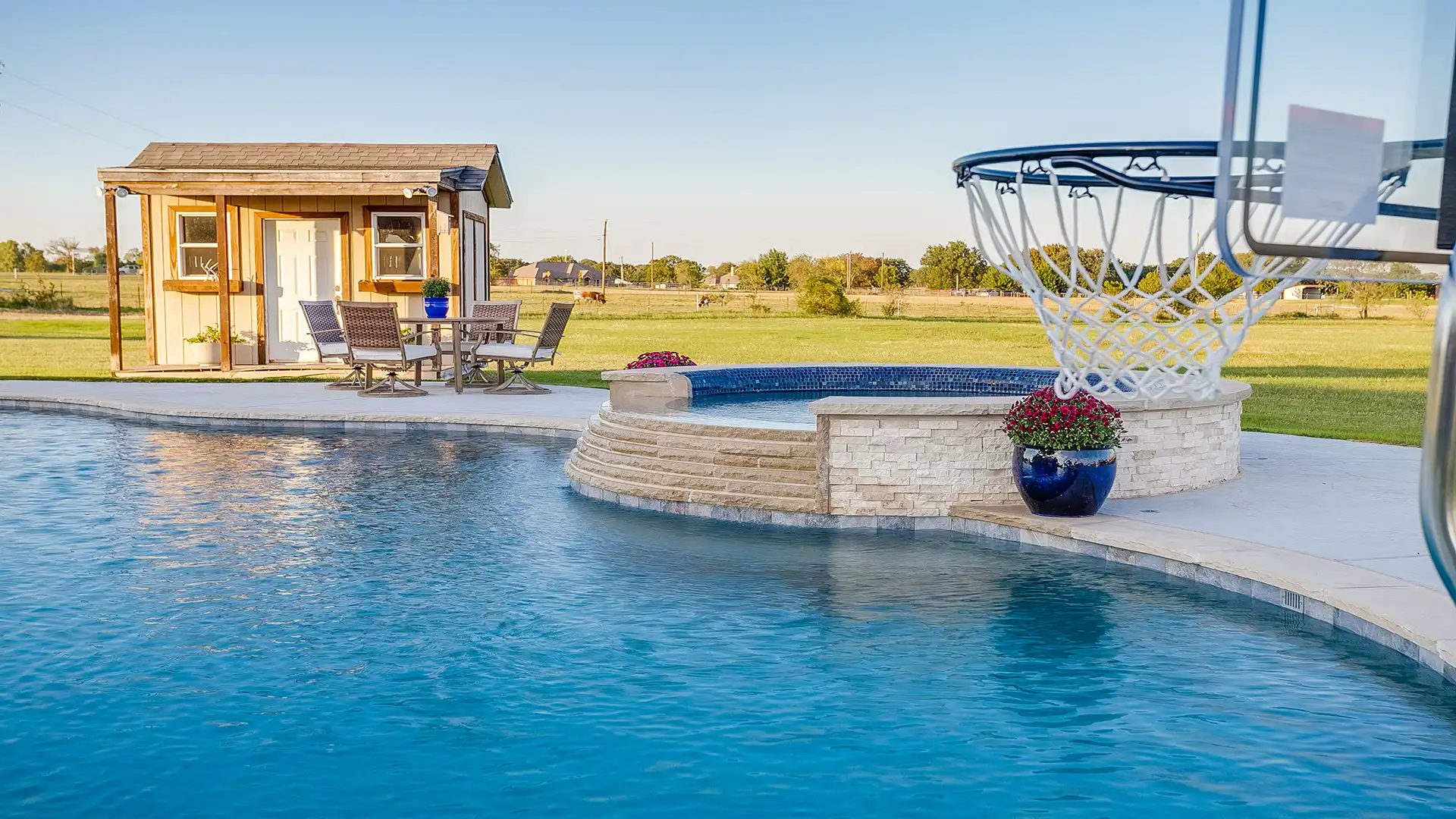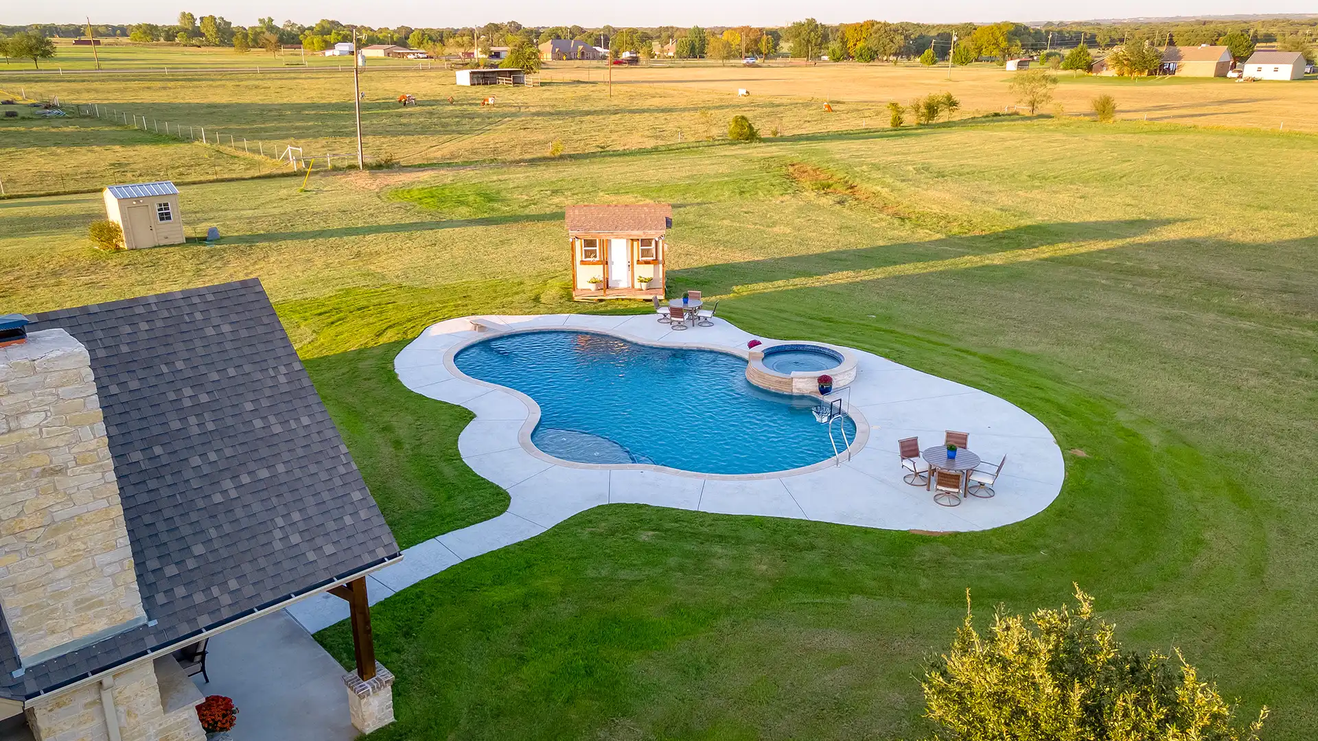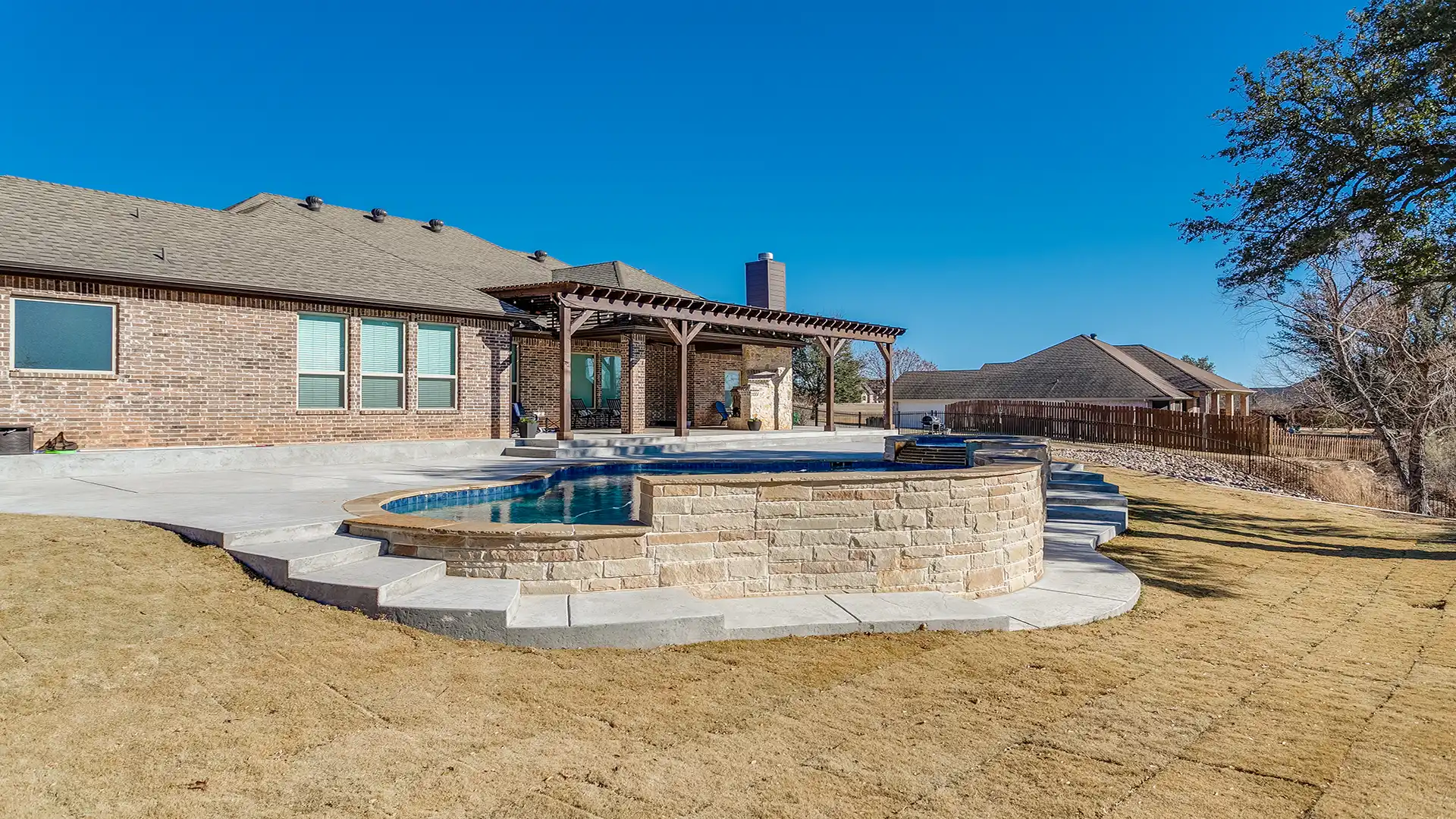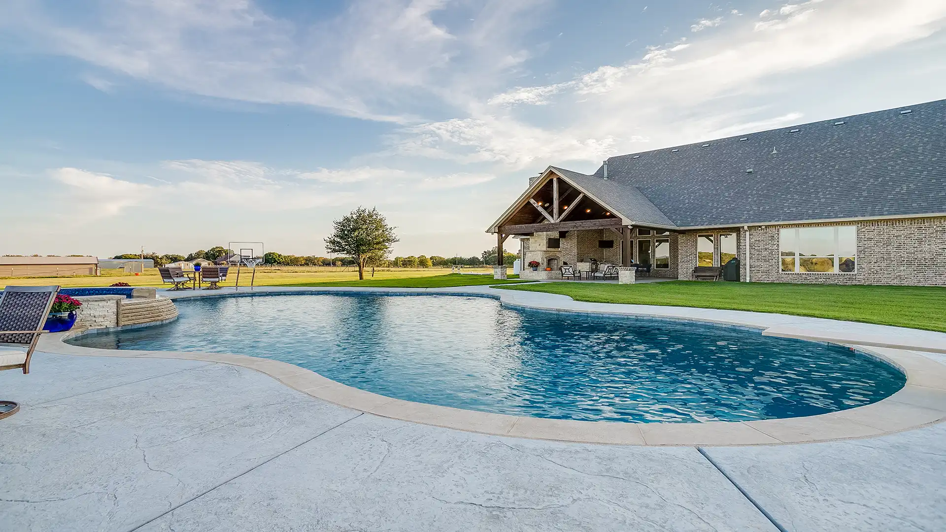 - We also help complete the space with pool houses, pergolas, fire pits, outdoor living features, and everything else needed to transform your backyard.