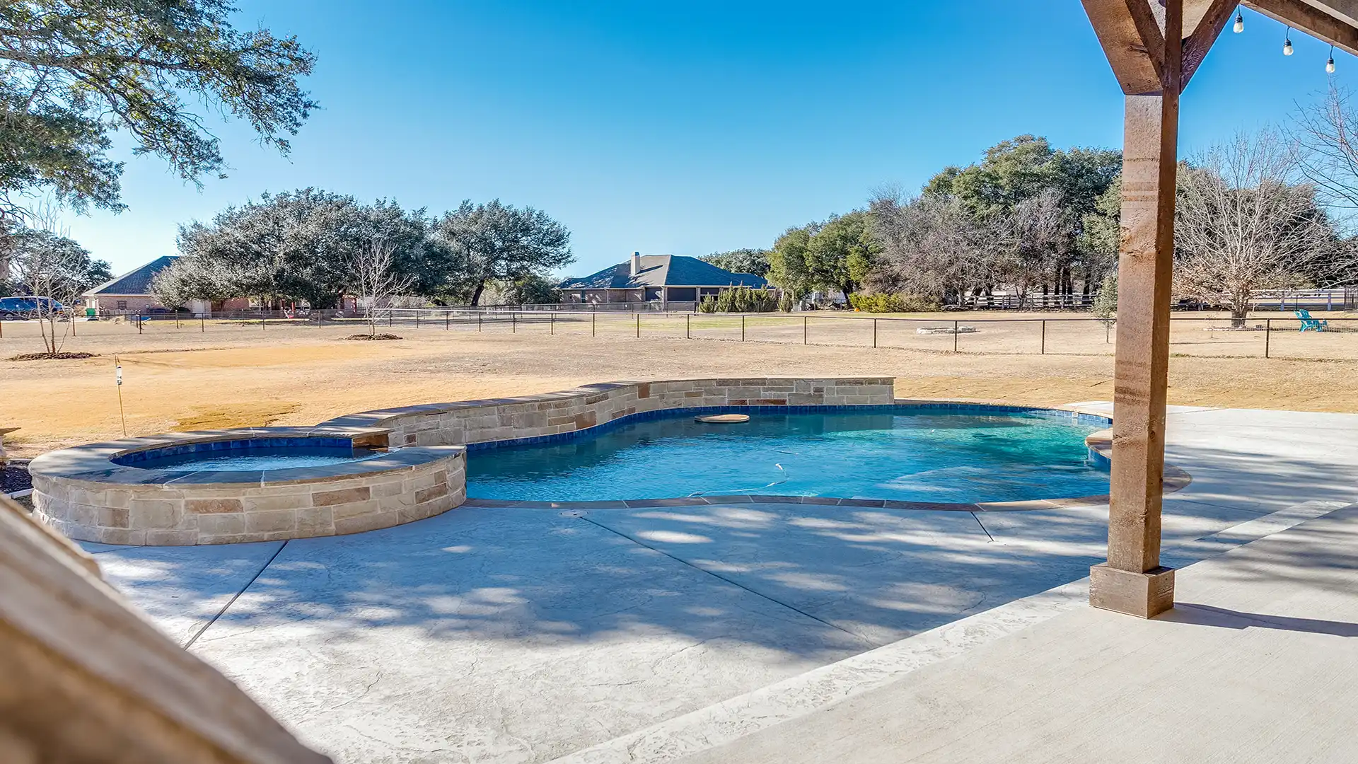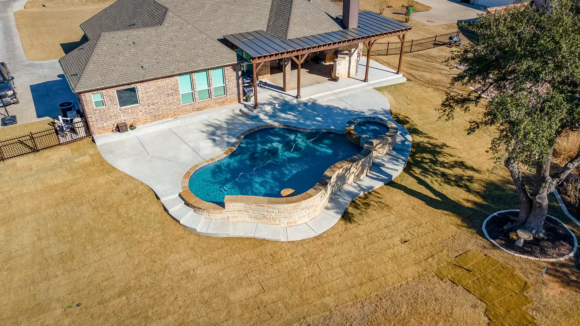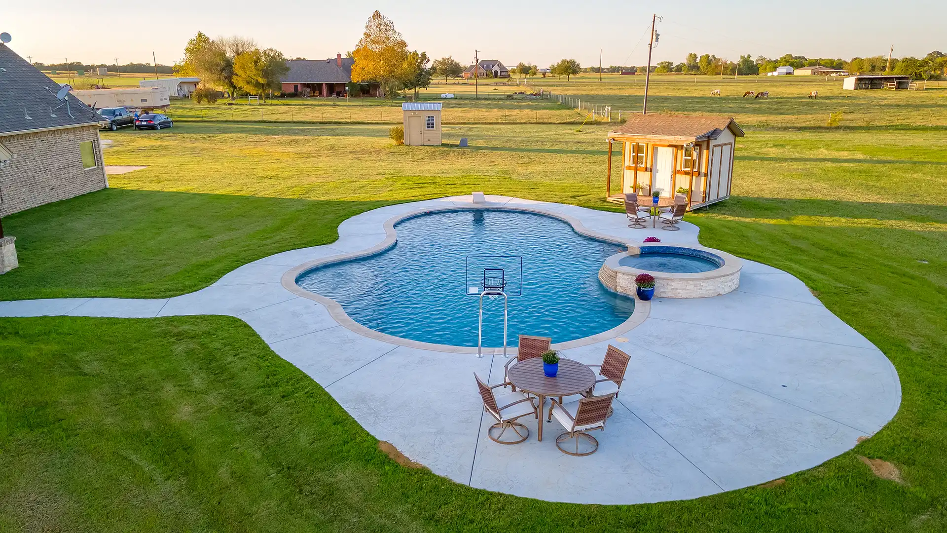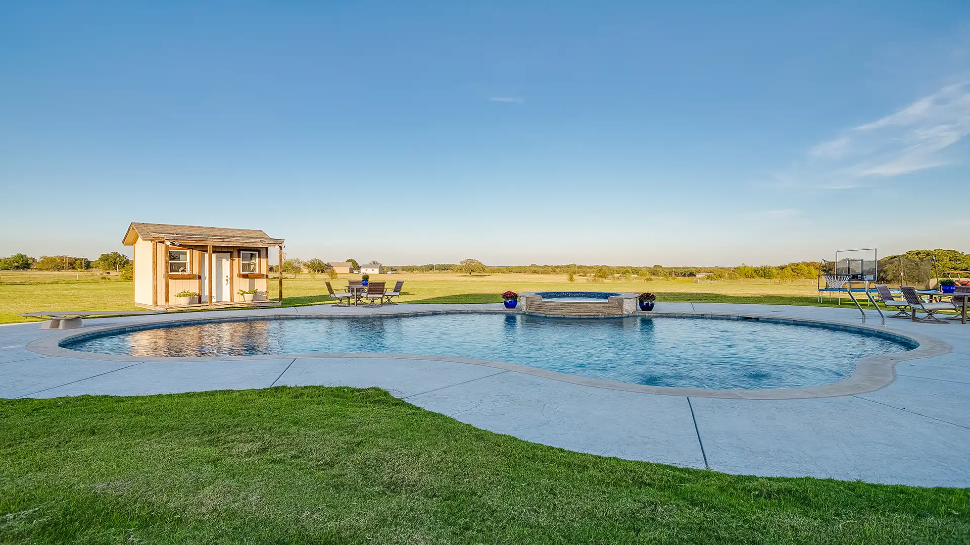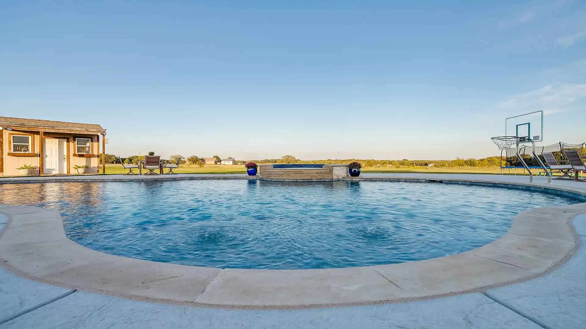 - We also help complete the space with pool houses, pergolas, fire pits, outdoor living features, and everything else needed to transform your backyard.